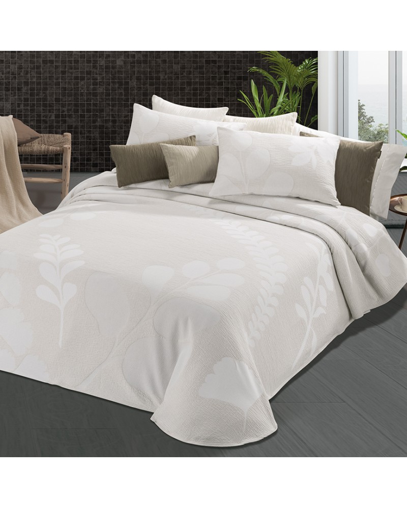 Set colcha cubrecama jacquard algodon con dibujo tejido de hojas en tonos huesos y blanco - Helecho