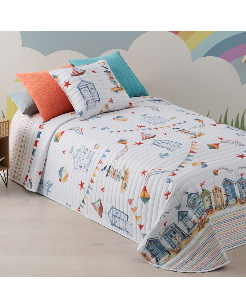 El bouti tiene un divertido estampado de casitas playeras con cometas y banderas en la parte superior . El dibujo es continuo.