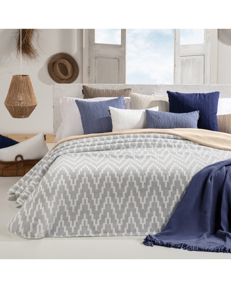 Colcha cubrecama jacquard dibujo geométrico azul y beige - Tribal
