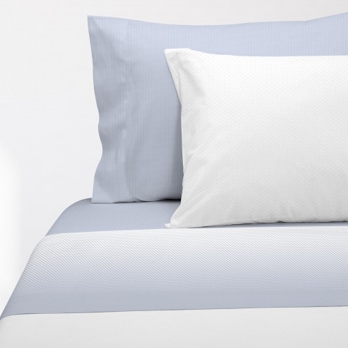 La sábana bajera va estampada con motitas pequeñas blancas sobre fondo de color.