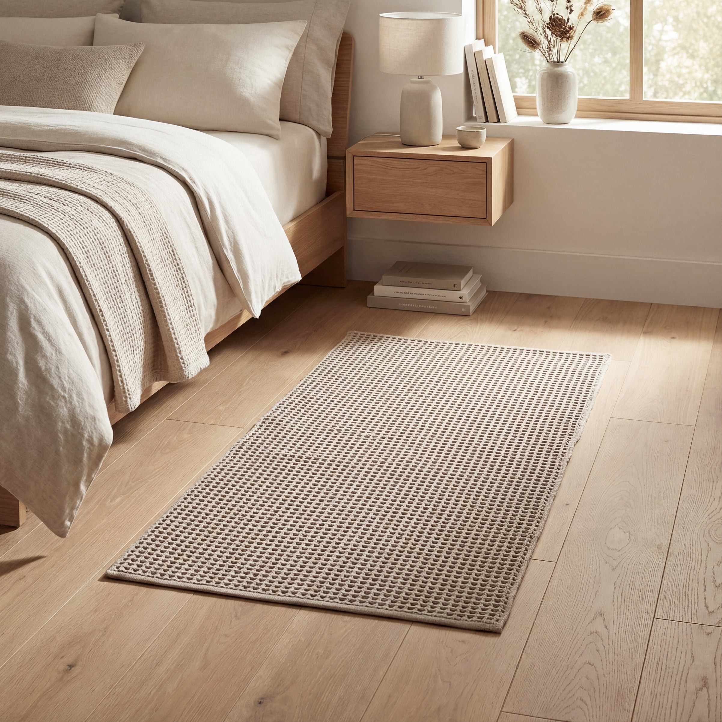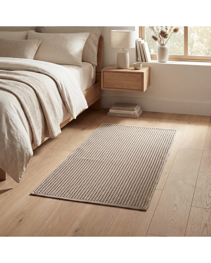 La alfombra Bee presenta un elegante diseño de pequeños cuadrados en relieve, creando una textura uniforme y actual que aporta calidez y estilo a cualquier espacio.