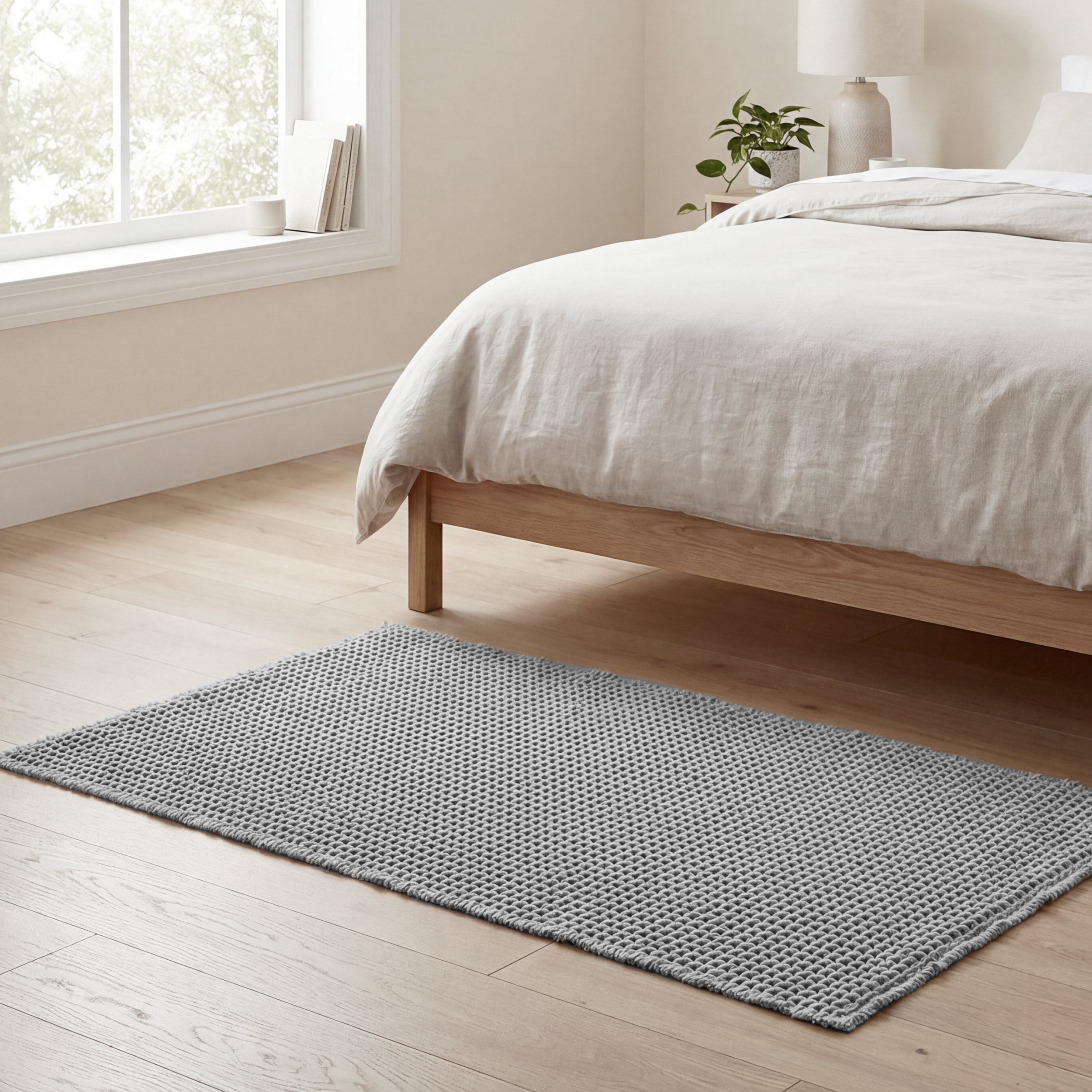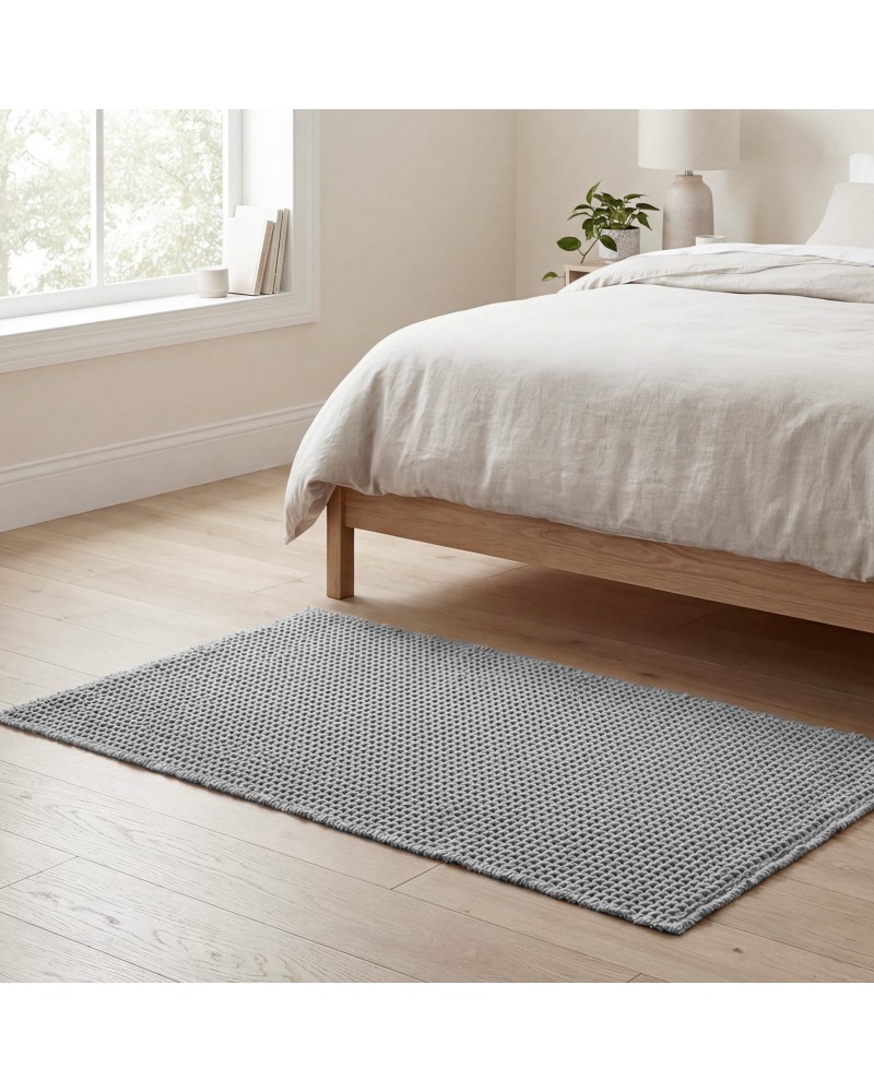 La alfombra Bee presenta un elegante diseño de pequeños cuadrados en relieve, creando una textura uniforme y actual que aporta calidez y estilo a cualquier espacio.