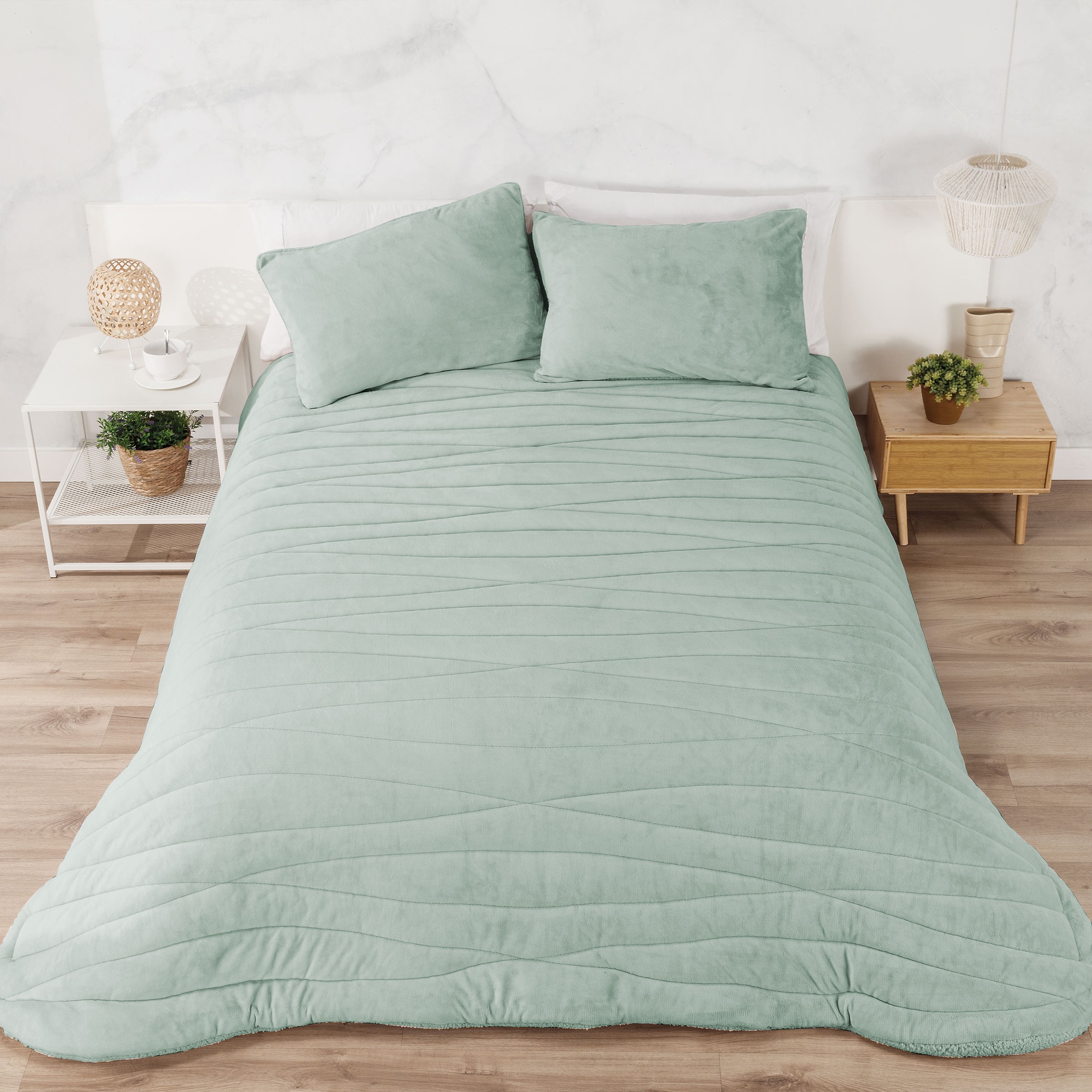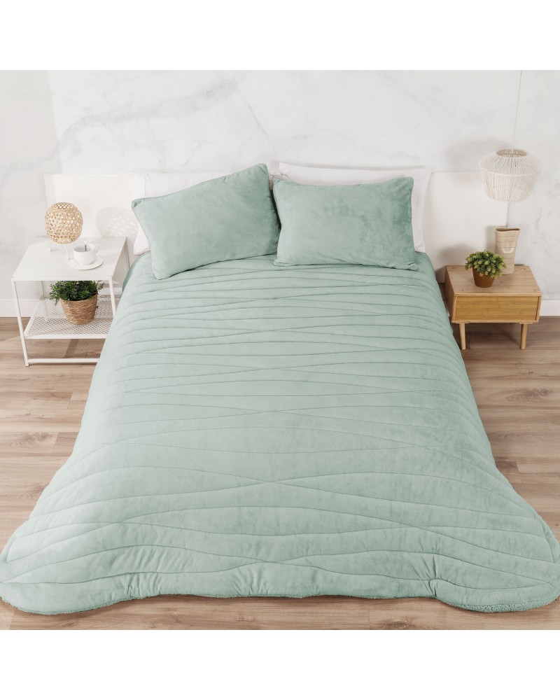 Edredón borreguito y terciopelo rayas geométricas verde agua - Mare