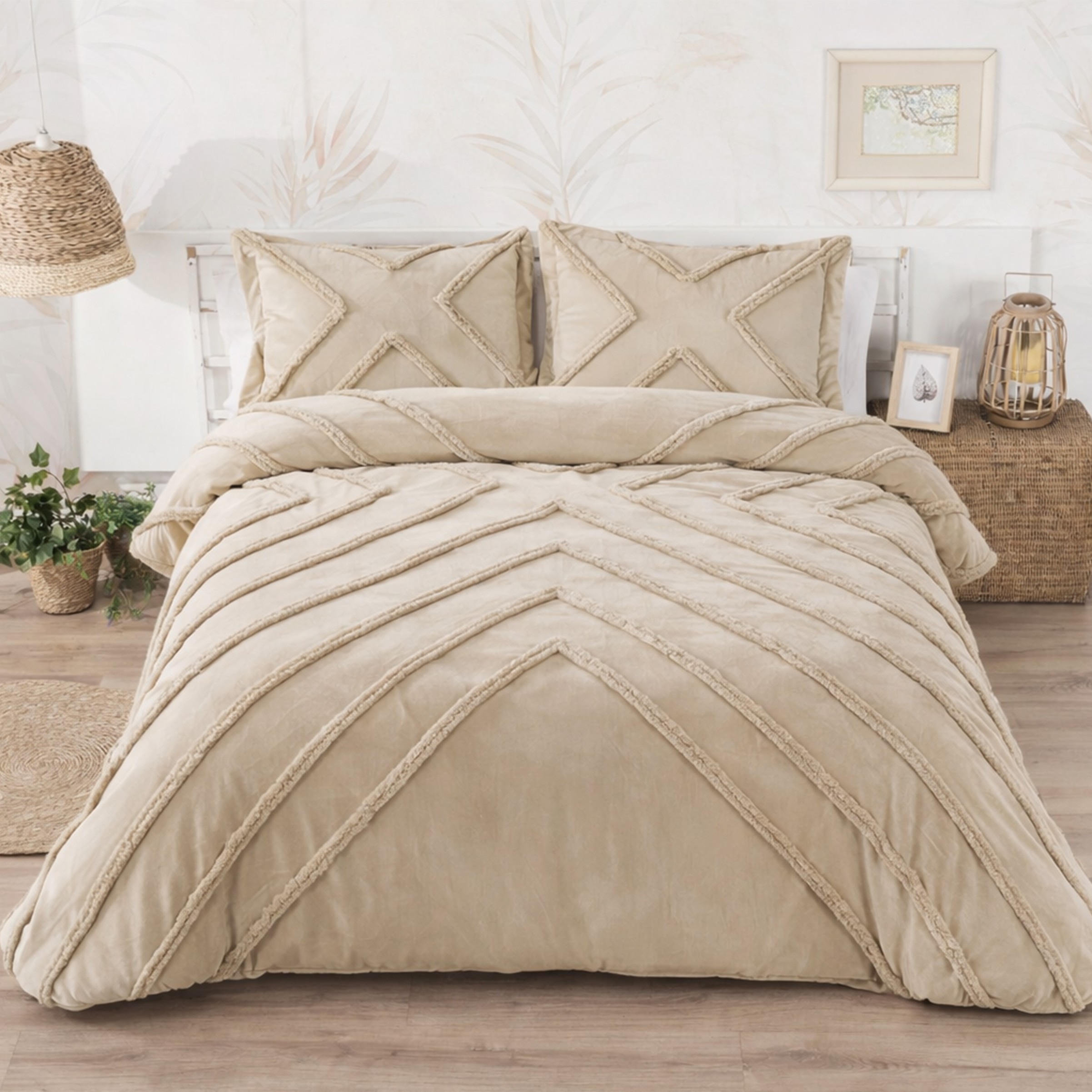 Edredón de diseño elegante y confortable, con una cara superior de suave terciopelo decorada con líneas horizontales irregulares formadas por un aplique que sobresale, creando un efecto de relieve que aporta textura, volumen y un toque moderno al conjunto. Este detalle estructural realza la estética del edredón, convirtiéndolo en una pieza decorativa única.