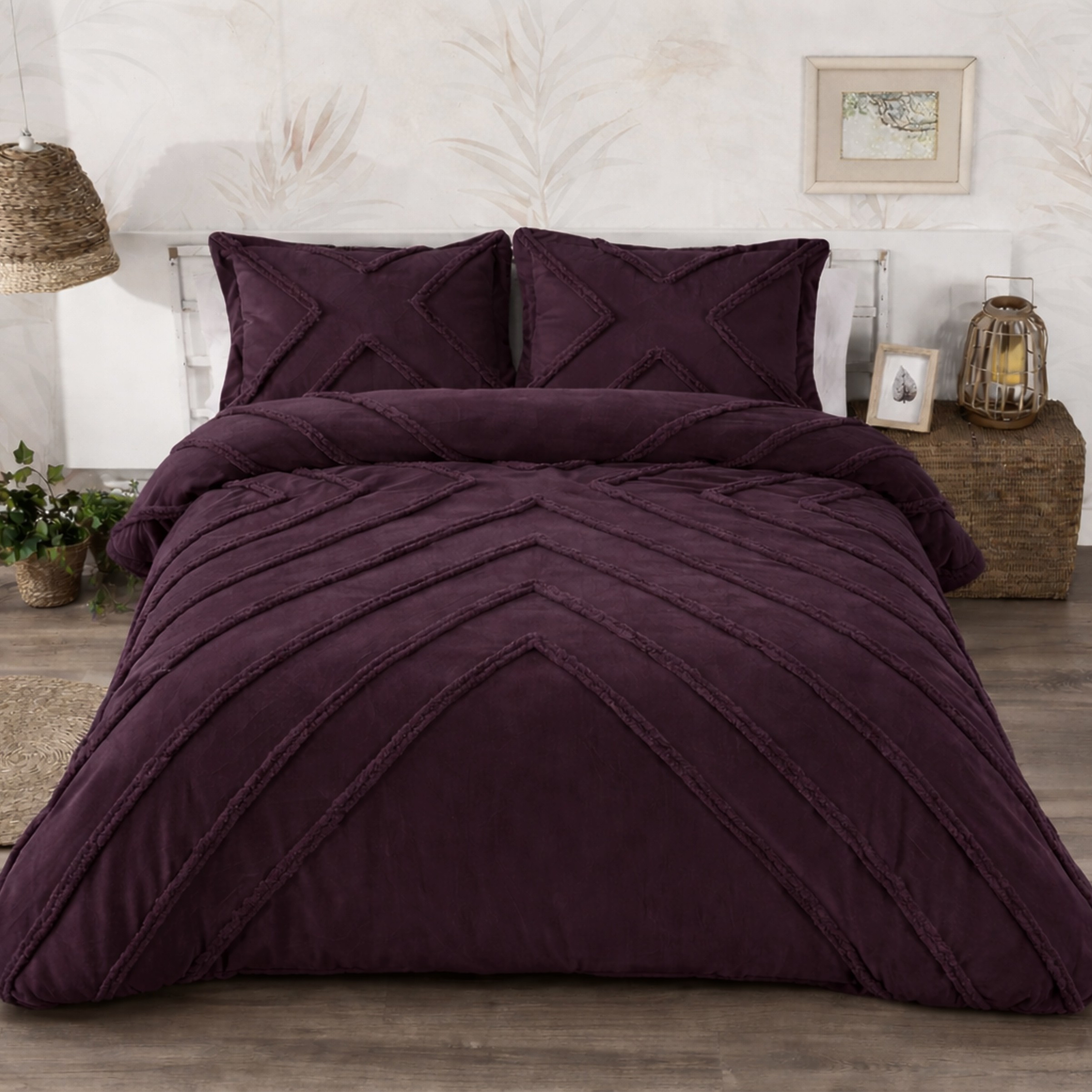 Edredón de diseño elegante y confortable, con una cara superior de suave terciopelo decorada con líneas horizontales irregulares formadas por un aplique que sobresale, creando un efecto de relieve que aporta textura, volumen y un toque moderno al conjunto. Este detalle estructural realza la estética del edredón, convirtiéndolo en una pieza decorativa única.