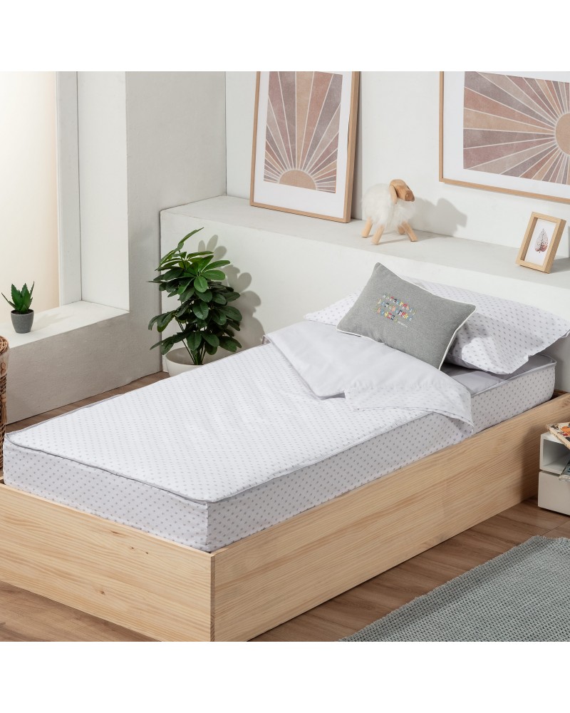 El saco se une a la bajera con cremalleras, impidiendo que se destape durante la noche y facilitando dejar la cama aseada por la mañana.