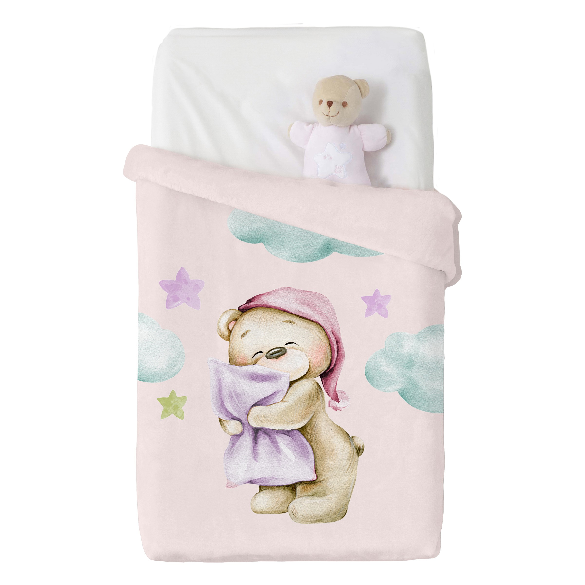 El diseño encantador de un osito con gorro de dormir abrazando su almohada aporta ternura y calidez al ambiente, convirtiendo la manta en un detalle decorativo perfecto para la cuna y en un imprescindible para acompañar los sueños de tu pequeño.