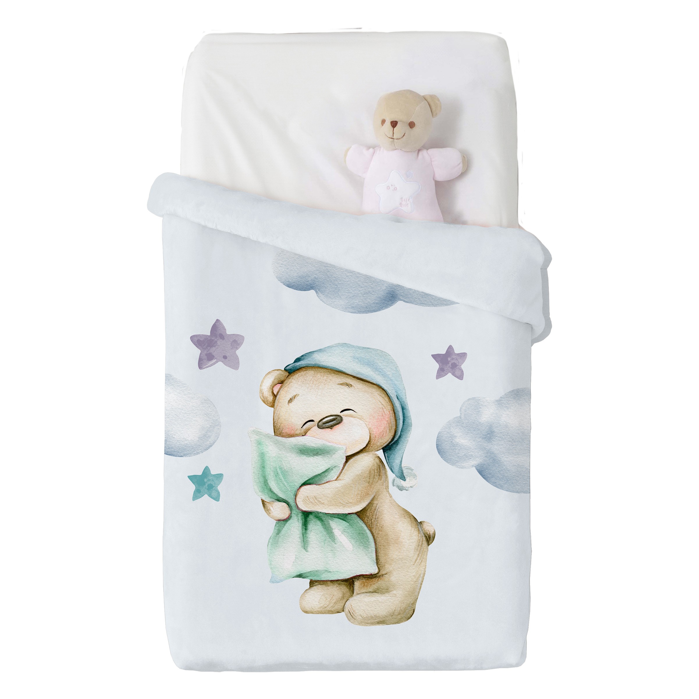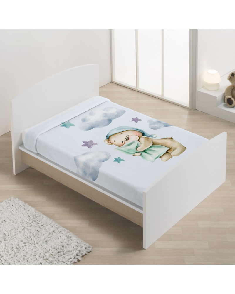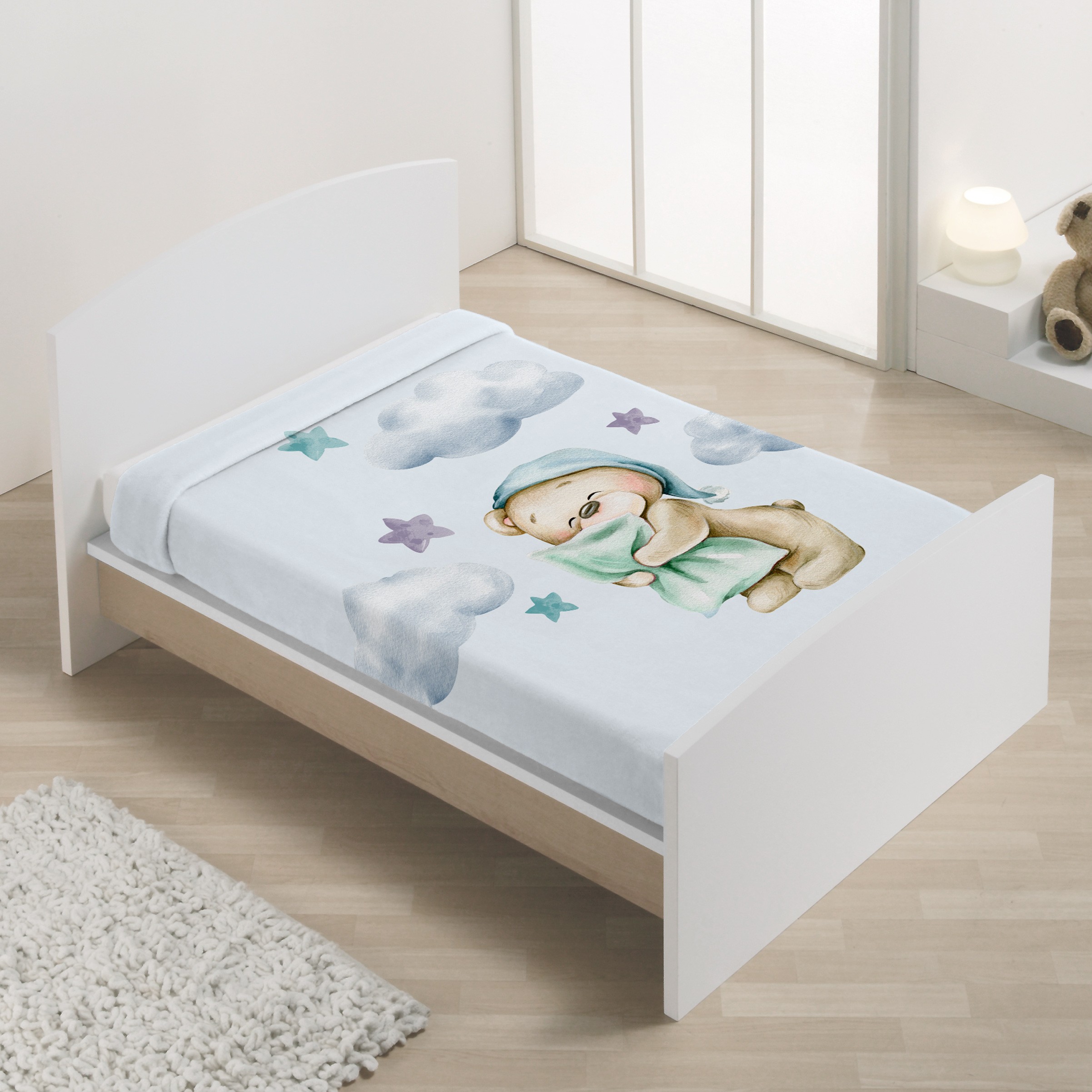 El diseño encantador de un osito con gorro de dormir abrazando su almohada aporta ternura y calidez al ambiente, convirtiendo la manta en un detalle decorativo perfecto para la cuna y en un imprescindible para acompañar los sueños de tu pequeño.