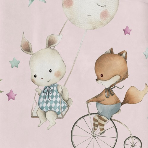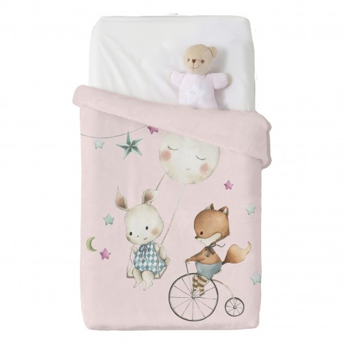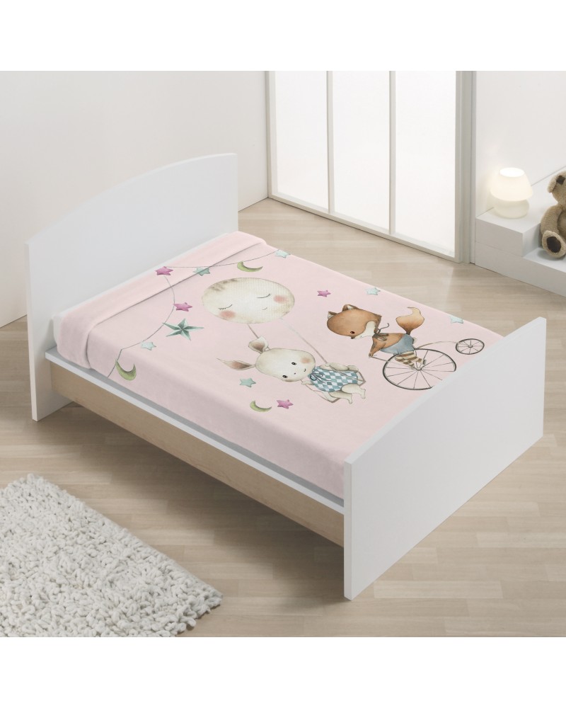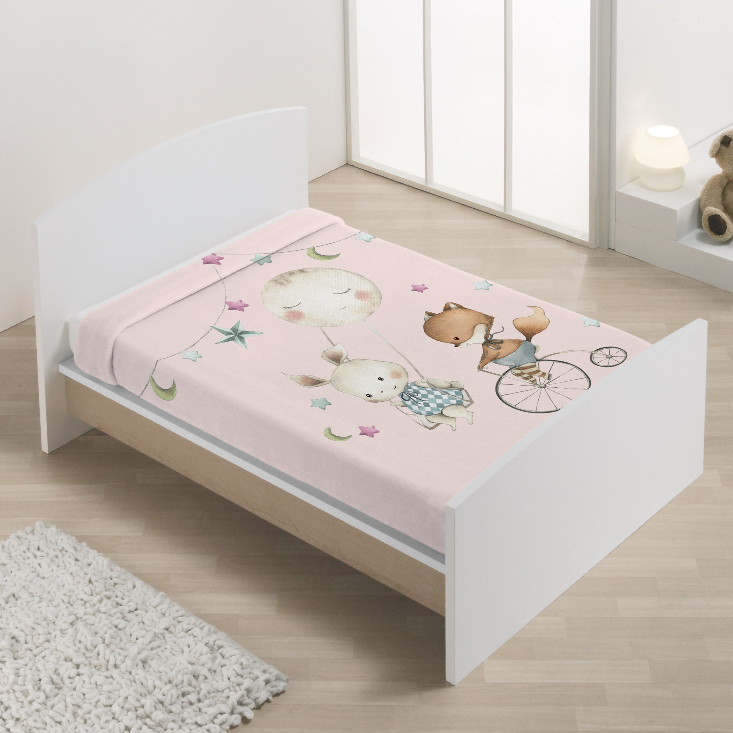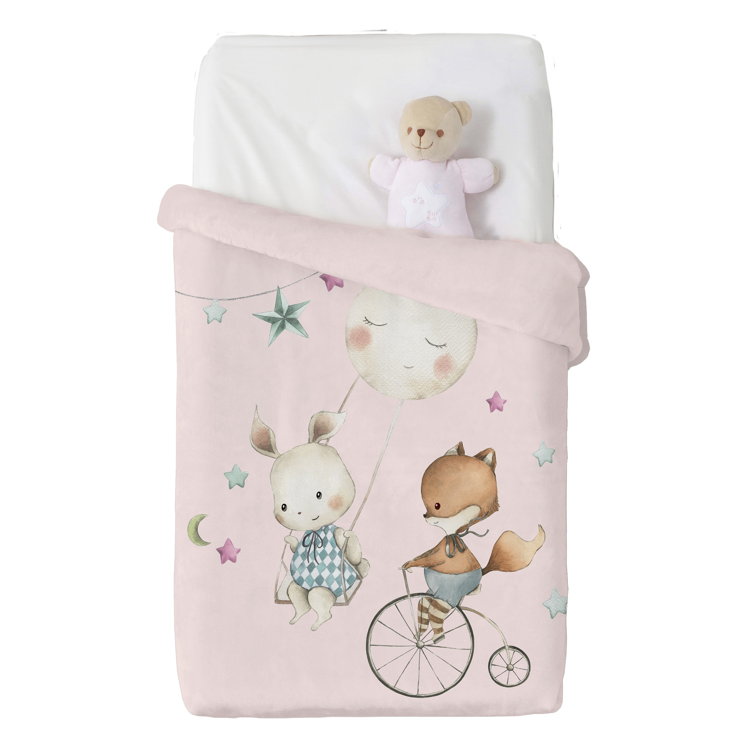 Con un diseño encantador de un zorrito montado en un biciblo y un conejito columpiandose en la luna, rodeado de estrellitas, esta manta no solo abriga, también decora y aporta ternura al espacio del bebé, convirtiéndose en un complemento imprescindible en la cuna.