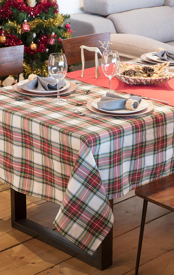 Mantel navideño confeccionado con hilo tintado y con acabado anti-manchas.