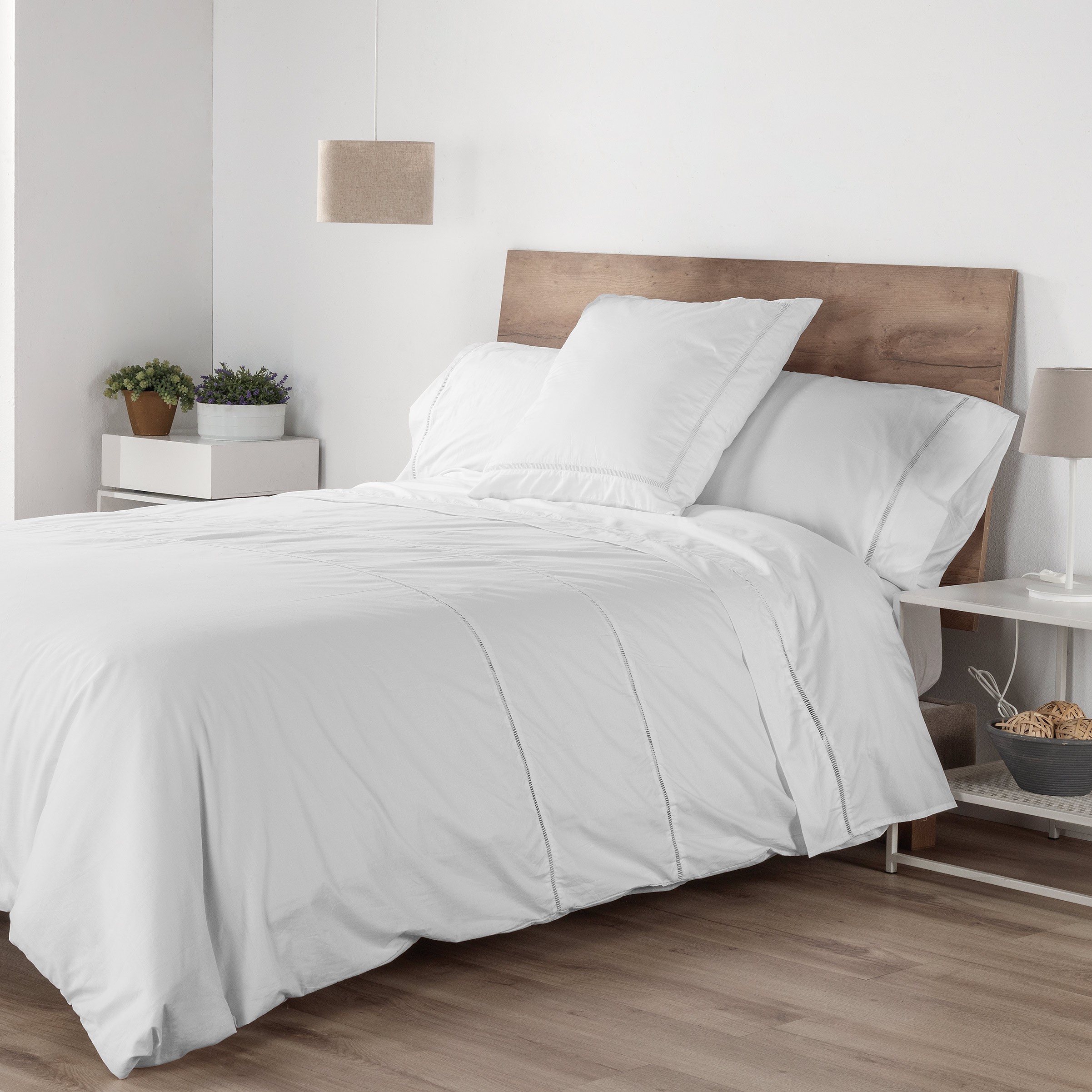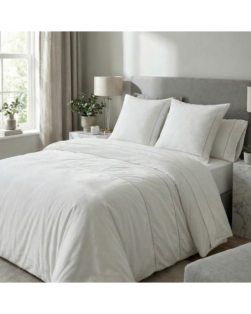 La funda nórdica incorpora una delicada vainica decorativa, que recorre la pieza aportando un detalle distintivo de inspiración artesanal. Este acabado se integra de forma sutil en un diseño liso y equilibrado.