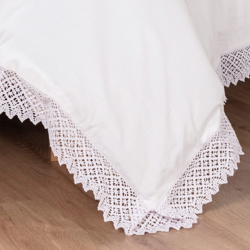 La funda nórdica se distingue por su acabado de encaje tipo crochet en el contorno, un detalle ornamental que aporta textura, movimiento y un refinado aire artesanal.