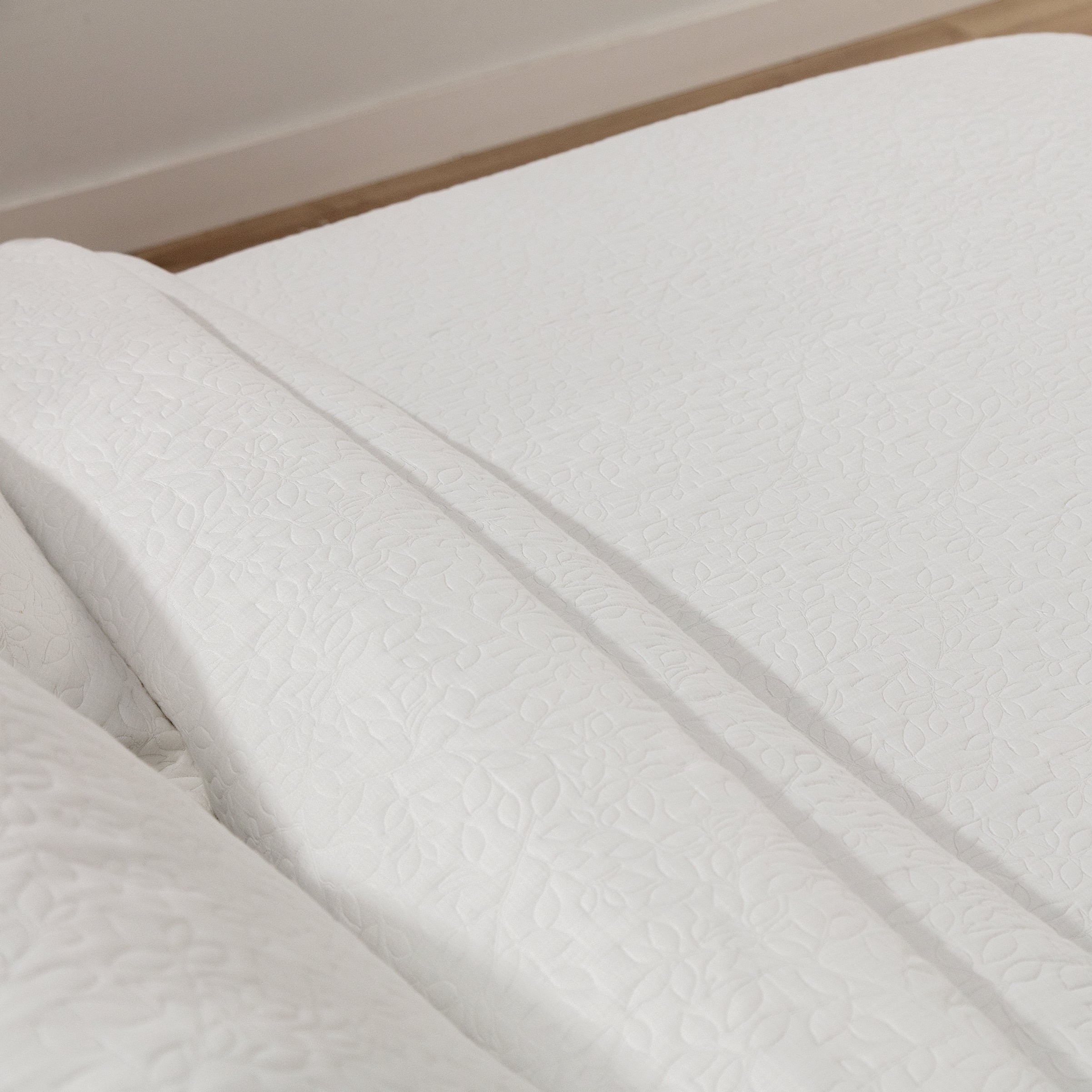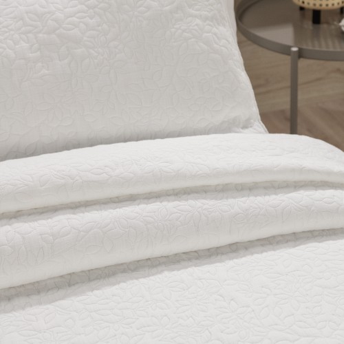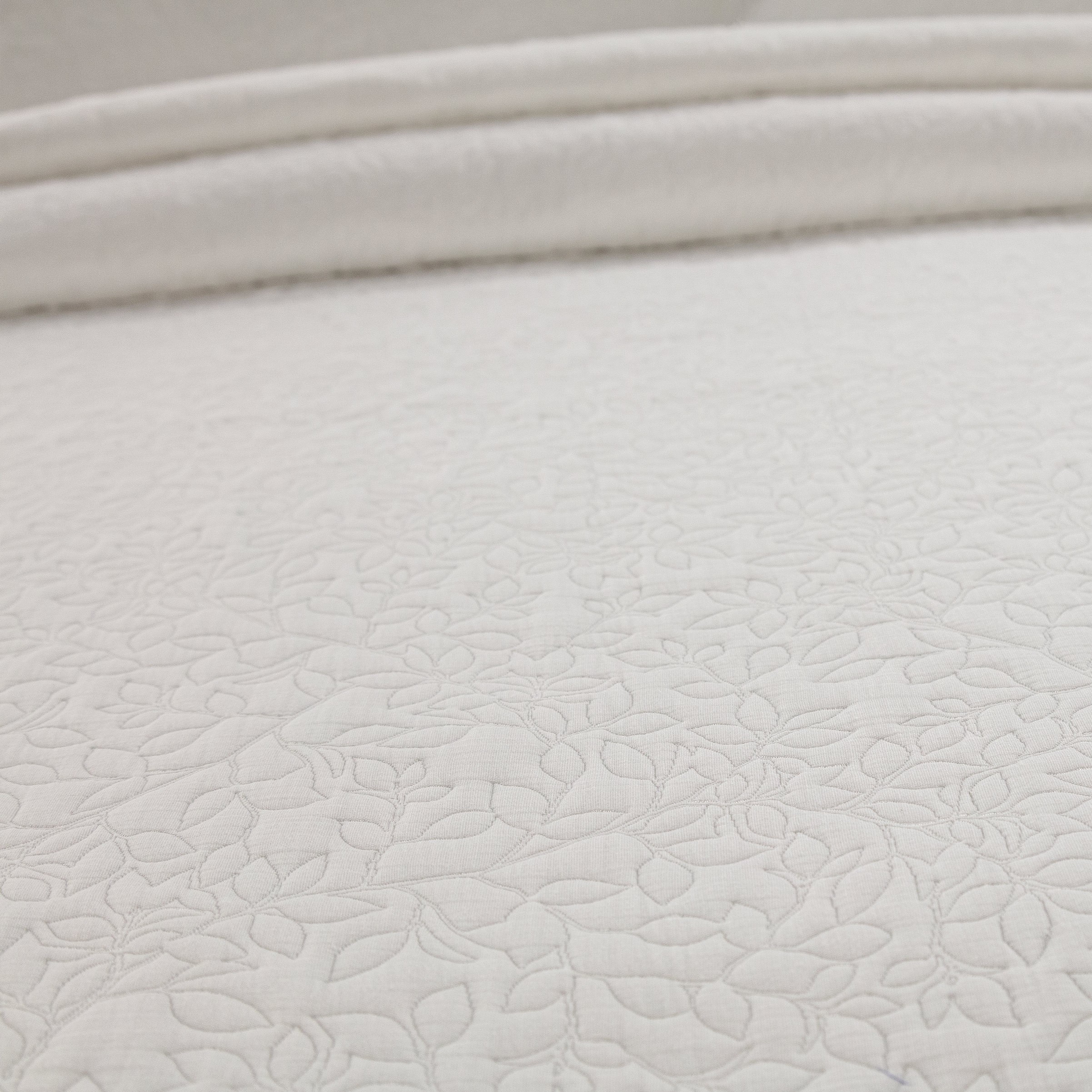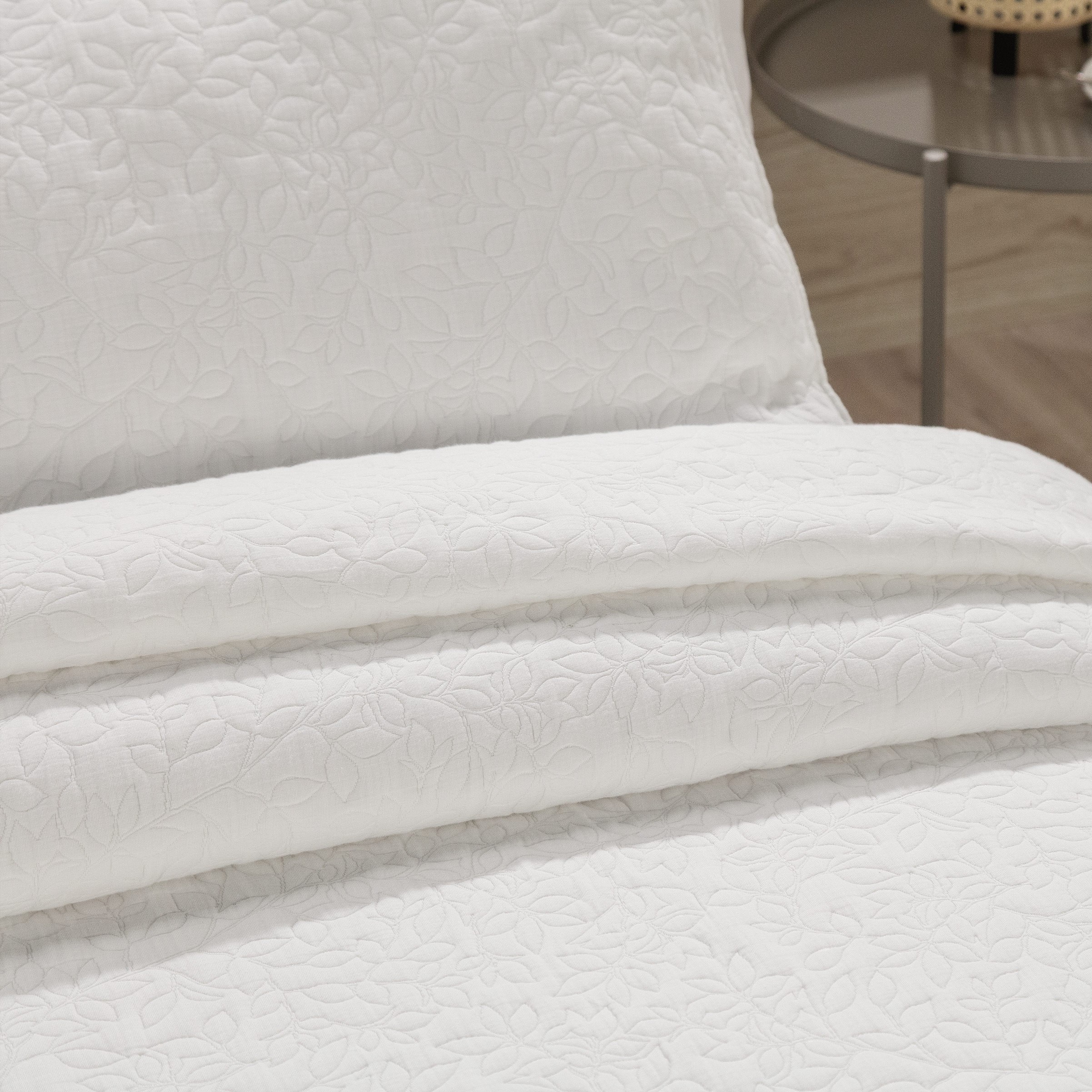 La colcha Aspen presenta un elegante diseño de hojas creado mediante acolchado, donde el dibujo no está estampado, sino que se genera a través del propio proceso de confección.