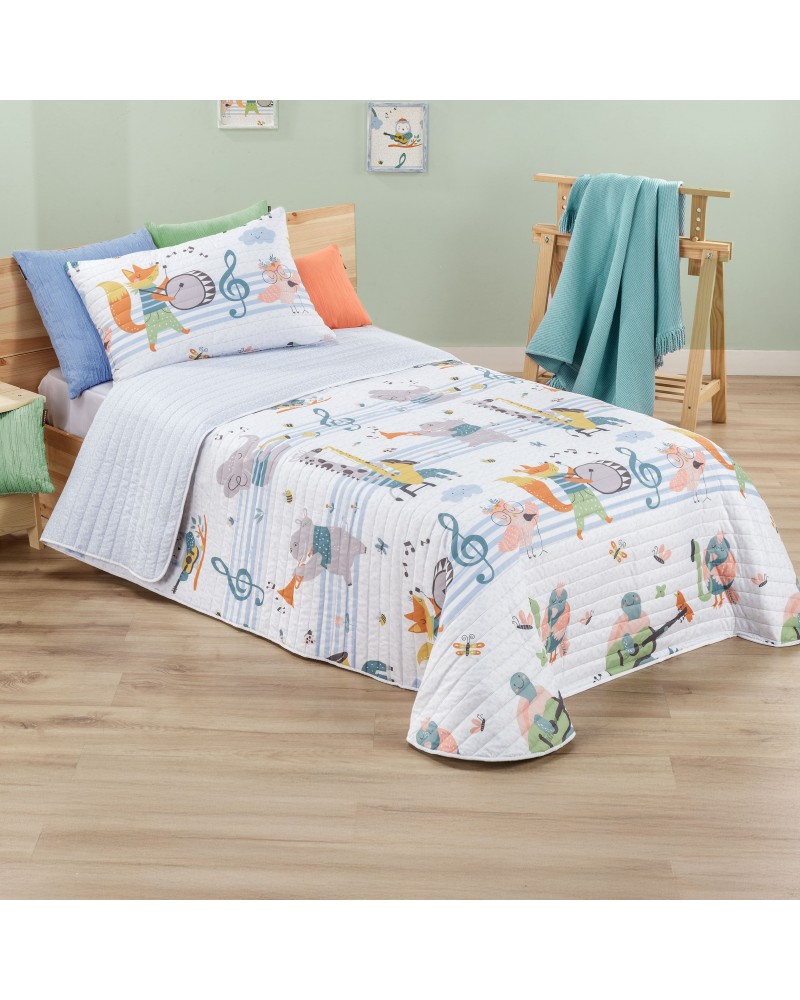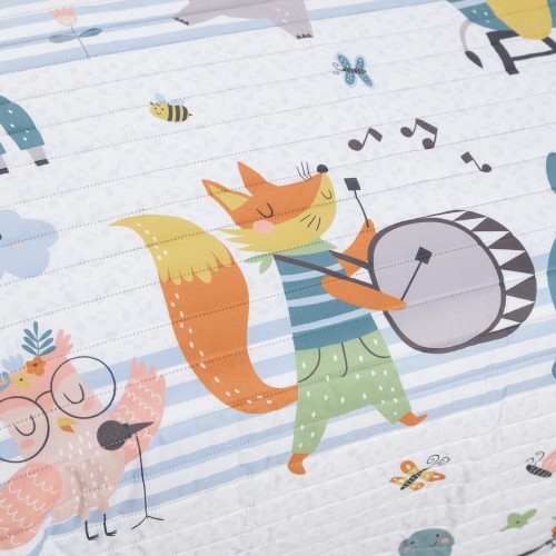 El bouti infantil presenta un diseño alegre y creativo, protagonizado por divertidos animales músicos, notas musicales y pequeños elementos ilustrados sobre un fondo de suaves rayas, generando una composición dinámica, colorida y llena de movimiento.