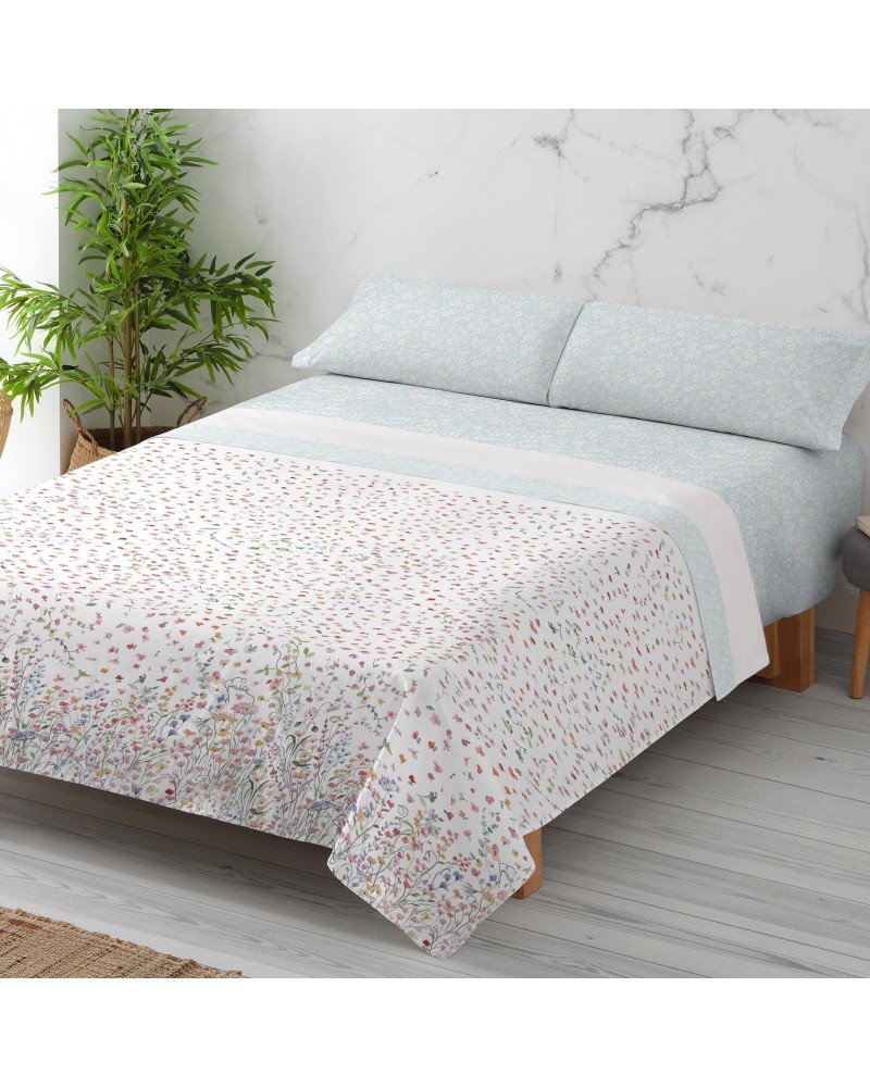 El juego de sábanas presenta un diseño floral de inspiración natural, con una composición ligera y delicada de pequeñas flores en tonos multicolor que aportan frescura y dinamismo al dormitorio.