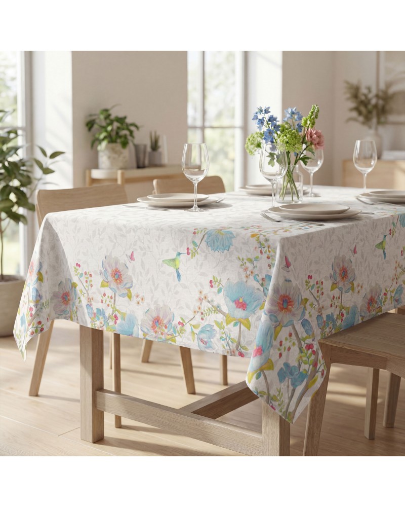 Mantel de diseño floral inspirado en flores silvestres, con una composición ligera y natural en tonos suaves que aportan frescura y luminosidad a la mesa.