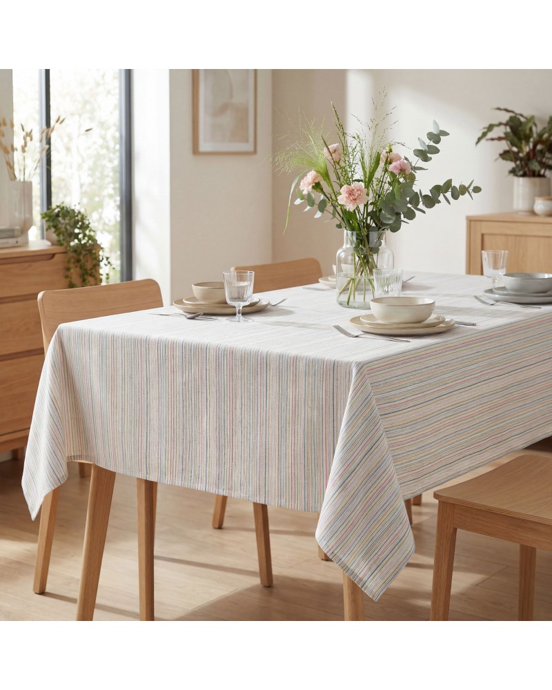 Mantel de diseño actual con finas rayas multicolor, dispuestas de forma delicada para crear un efecto visual ligero y equilibrado.