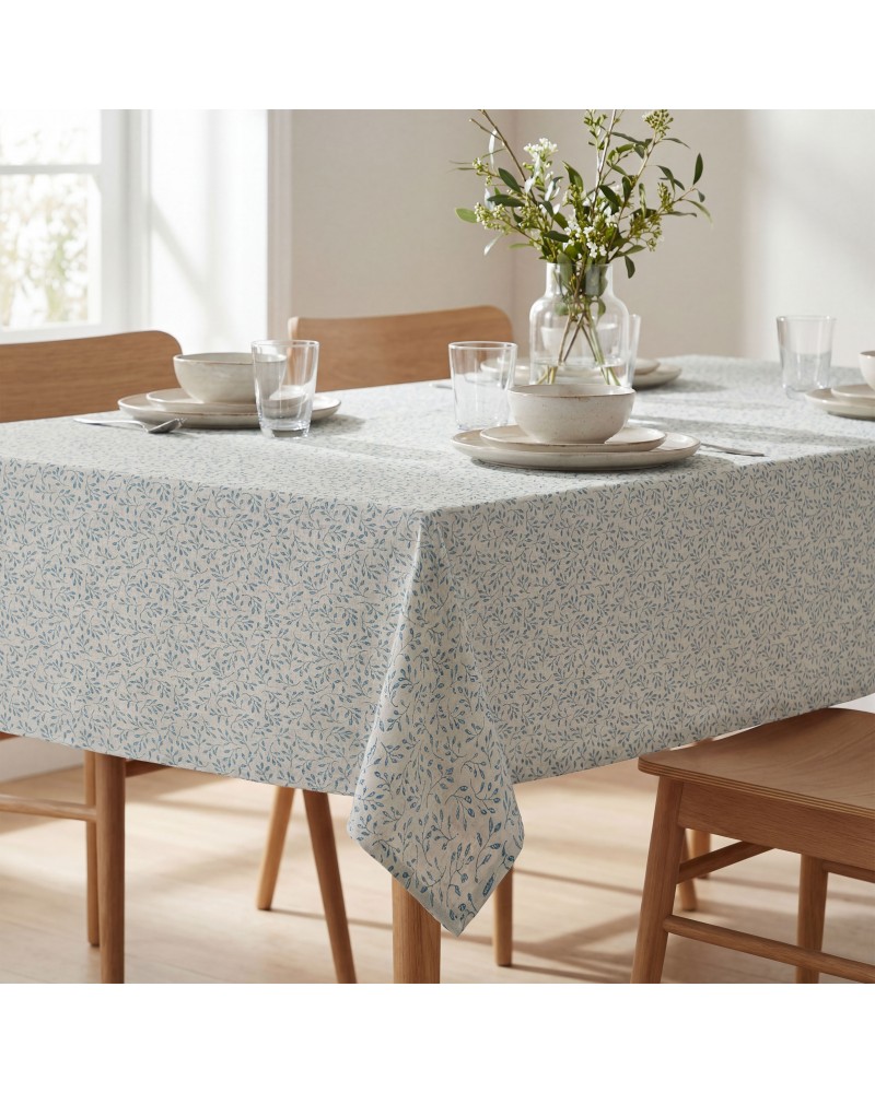 Mantel con un delicado estampado de pequeñas hojas y motivos florales en tono verde, distribuido de forma uniforme para crear un efecto ligero y continuo.