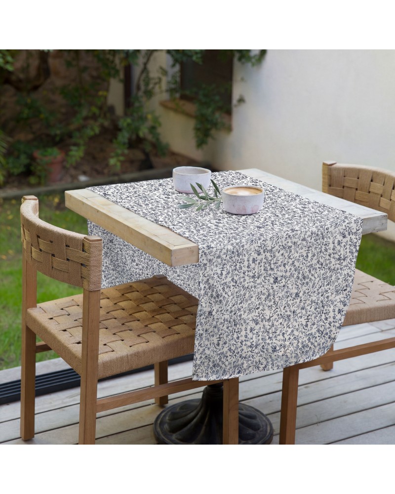 Camino de mesa con un delicado estampado floral en tonos azules, inspirado en motivos botánicos de trazo fino que crean un efecto continuo, ligero y elegante.