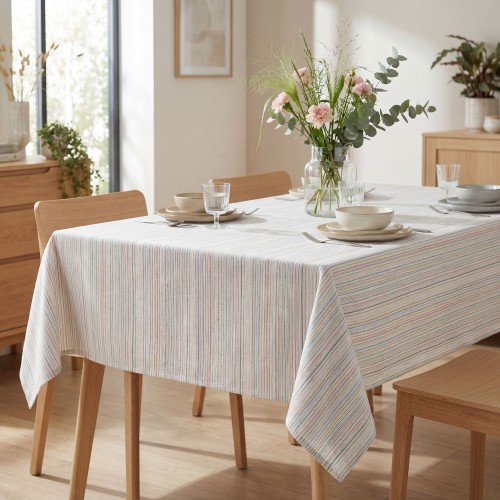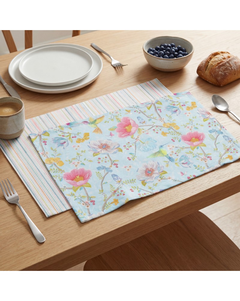 Set de 2 manteles individuales reversibles con un diseño floral de estilo acuarela en tonos suaves, combinado con una cara de rayas finas multicolor a contraste.